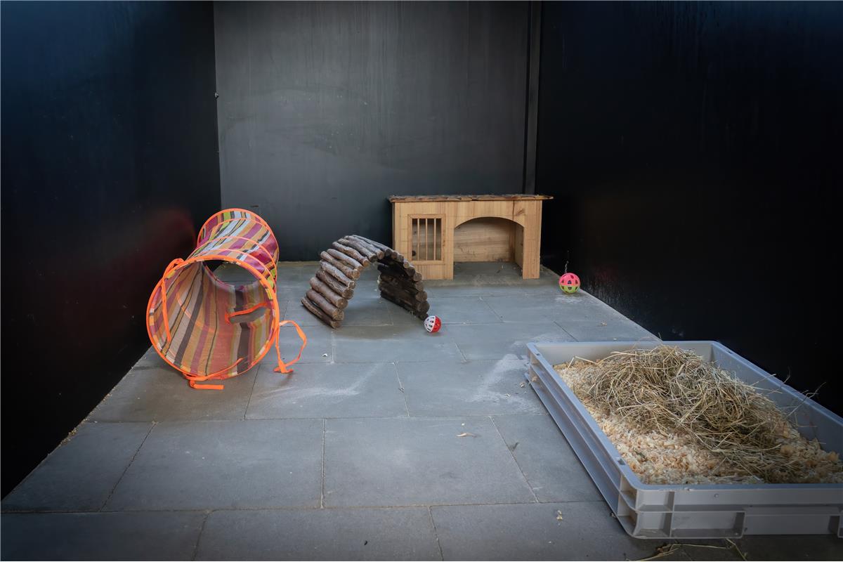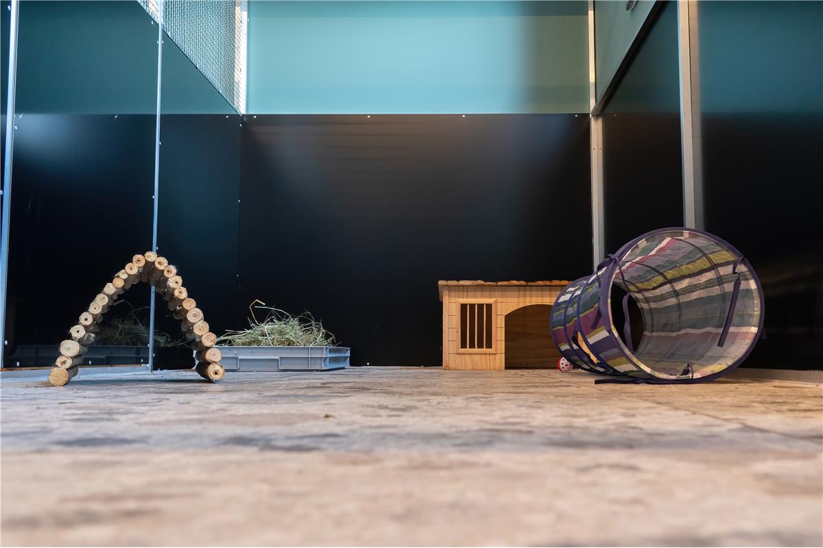 De konijntjes krijgen een buitenren van 2,5m2of 3,13m2 of een binnenren van 3,5m2(voorzien van een toiletje met hooi, een houten huisje, een wilgenbruggetje en een tunnel), een drinkbus/potje, dagelijks verse groenten, hooi en korrels van Bunny Nature alsook de nodige aandacht en verzorging.